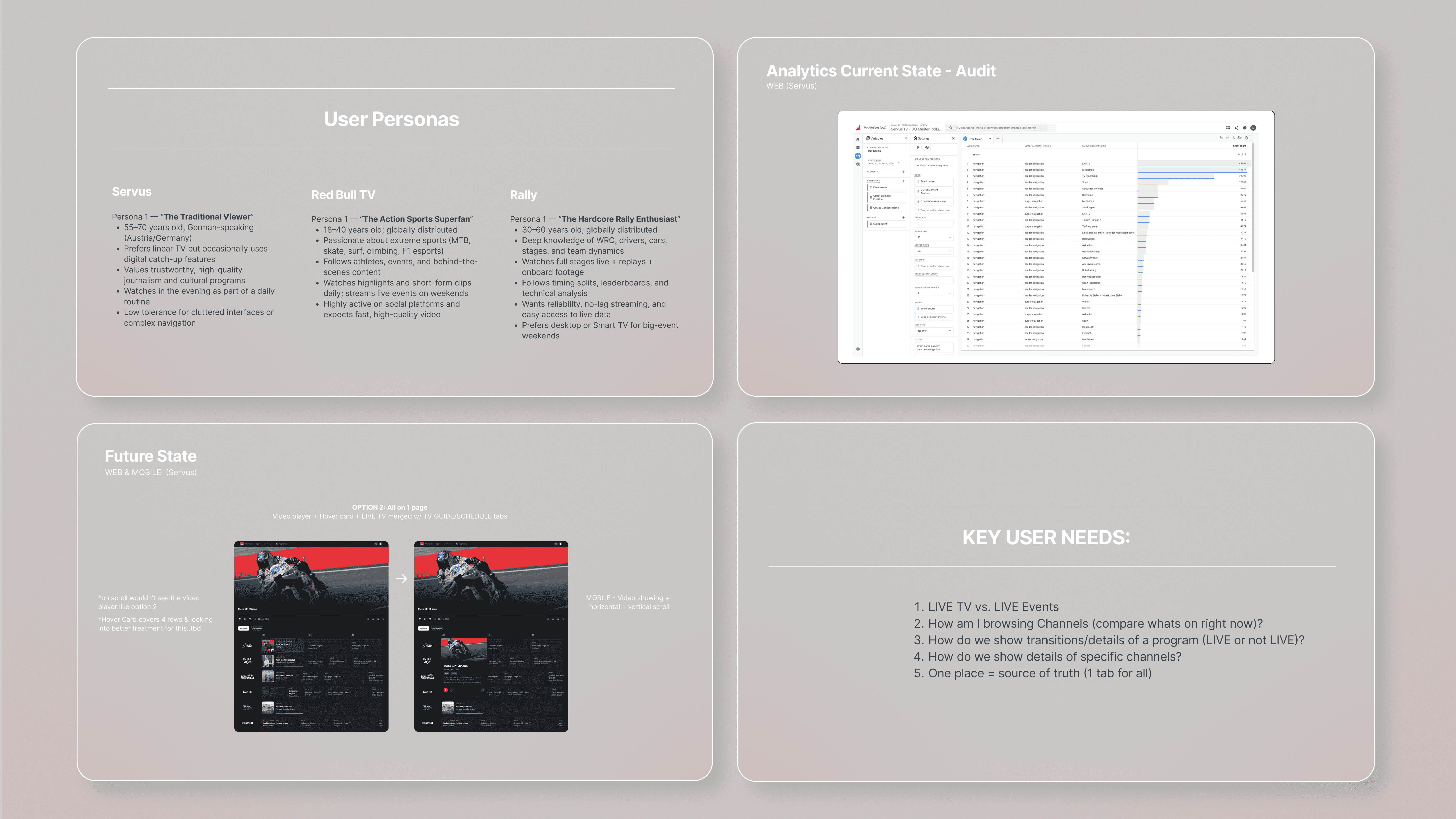 I began with competitor audits across 4 key functionalities (EPG page, navigation, video player & ad strategy) for both web + mobile & presented as dedicated decks for each.