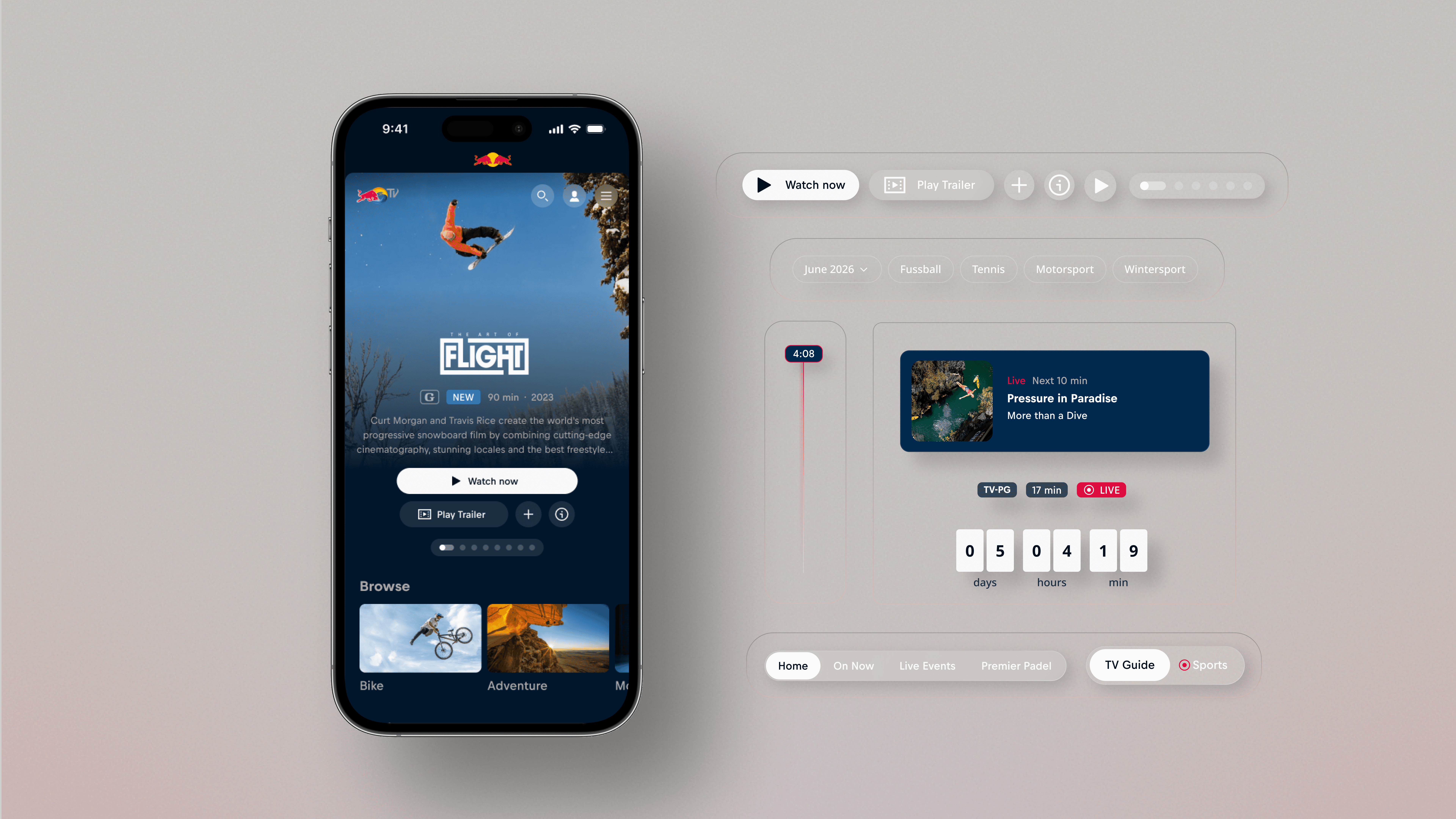 As lead product designer, I was brought in from the start, kicking off with a 1-week team workshop, tasked with redesigning the end-to-end UX/UI for Red Bull TV across 3 regional & sub-brand tenant platforms.